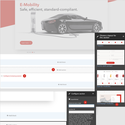 Füge die Section Homepage modules hinzu (siehe dazu oben unter Company purpose).