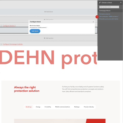 Diese Seite bietet eine Übersicht aller Drupal 9-Komponenten der DEHN-Homepage. Anhand der entsprechenden Erläuterungen erfahrt Ihr, wie sie Schritt für Schritt erstellt, editiert bzw. angepasst werden können. Über das Inhaltsverzeichnis (Übersicht) gelangt man per Sprungmarke zur gewünschten Komponente.