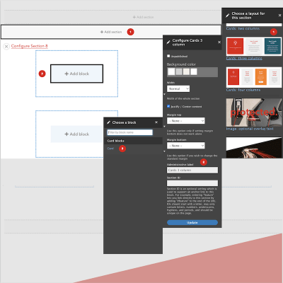 3. Füge jeder Spalte (Column) die Komponente Card über "Add block" hinzu.