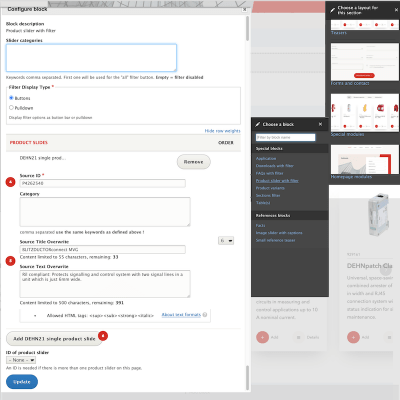 5. Da die Produkttexte für den Slider oft zu lang sind, werden sie über "Source Title Overwrite" bzw. "Source Text Overwrite" gekürzt überschrieben. Der Produkttitel soll 2 Zeilen nicht überschreiten.