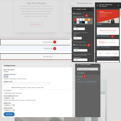3. Füge der Section die Komponente Headline über "add block" hinzu. Die Größe der Headline ist an dieser Stelle "H2".