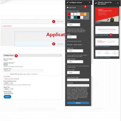 2. Wähle die Einstellungen für die Section aus. Für etwas mehr Aufmerksamkeit, wähle als Hintergrundfarbe "DEHN red" und definiere das "Administrative label" mit Plain: One Column (red) für eine bessere Übersicht im Backend.