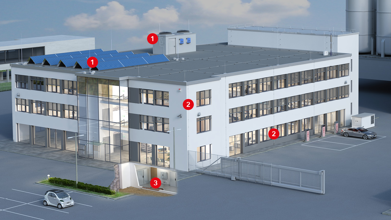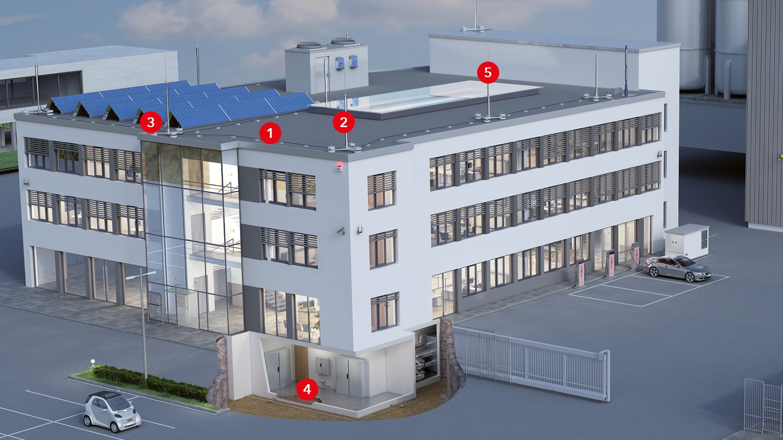 Durch große Flächen und komplexe Gebäudestrukturen ist ein äußeres Blitzschutzsystem bei Industrie- und Gewerbebauten besonders wichtig. Der äußere Blitzschutz sichert Gebäude und schützt PV-Module vor den Folgen eines direkten Blitzeinschlags. Die notwendigen Maßnahmen zur Umsetzung sind in der SN EN 62305-3 und SN 414022 geregelt.