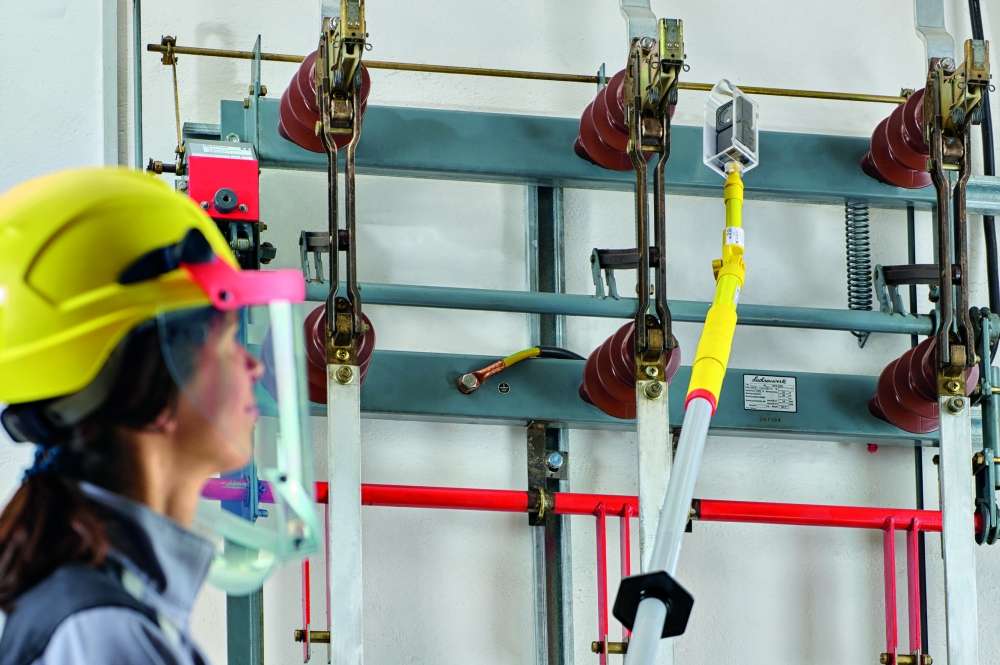 The insulating stick and remote operation keep electricians out of high-risk zones, minimizing exposure to dangerous voltages while still providing a real-time video feed.