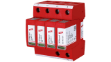 DEHNrail: Four-pole surge arrester consisting of a base part and plug-in protection module for 230 / 400 V systems; the FM version has a floating remote signalling contact.