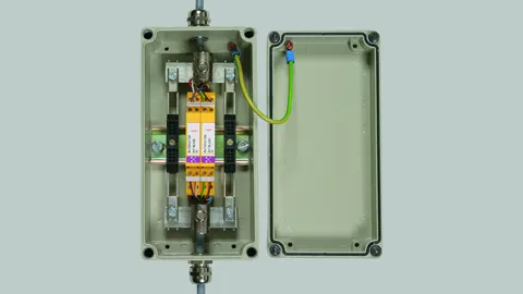 Bornas de conexión del apantallamiento resistentes a rayos con accesorios para el montaje para la compensación de potencial de protección contra el rayo de terminales de cable y caja de aluminio para el montaje de disposotivos sobre carril DIN.