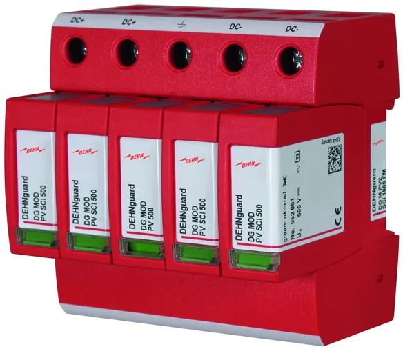 The patented SCI technology with active arc extinction allows to actively, quickly and safely extinguish a possible switching arc in case of overload. The PV fuse integrated in the short-circuit path trips immediately after the arc has been extinguished, thus ensuring safe electrical isolation (interruption). Consequently, all PV arresters from DEHN combine surge protection, fire protection and personal protection in a single device