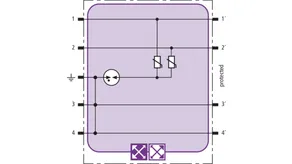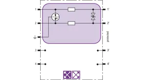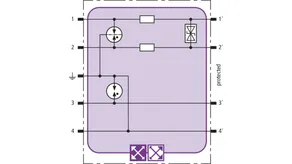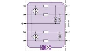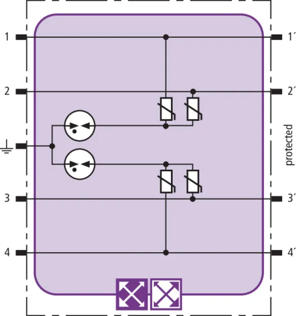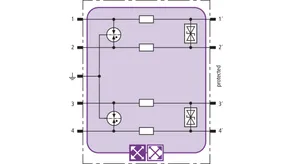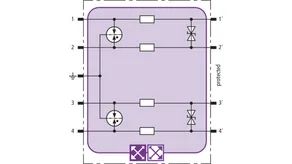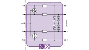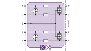 Space-saving combined lightning current and surge arrester module with RFID LifeCheck for protecting four single lines sharing a common reference potential as well as unbalanced interfaces. If LifeCheck detects thermal or electrical overload, the arrester has to be replaced. This status is indicated contactlessly by the DEHNrecord LC / SCM / MCM reader.