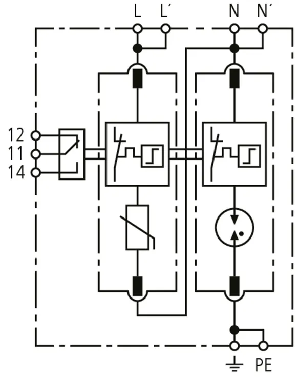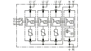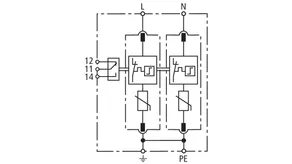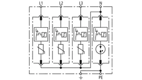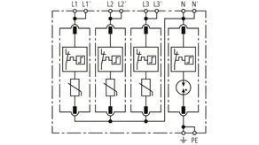 Modular surge arrester with a high total discharge capacity in the N-PE path for TT and TN systems (1+1 configuration); meets increased safety requirements by higher discharge capability; with floating remote signalling contact.