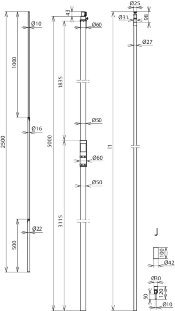 | Max. free length with air-termination rod (wall mounting) | 5000 mm |
