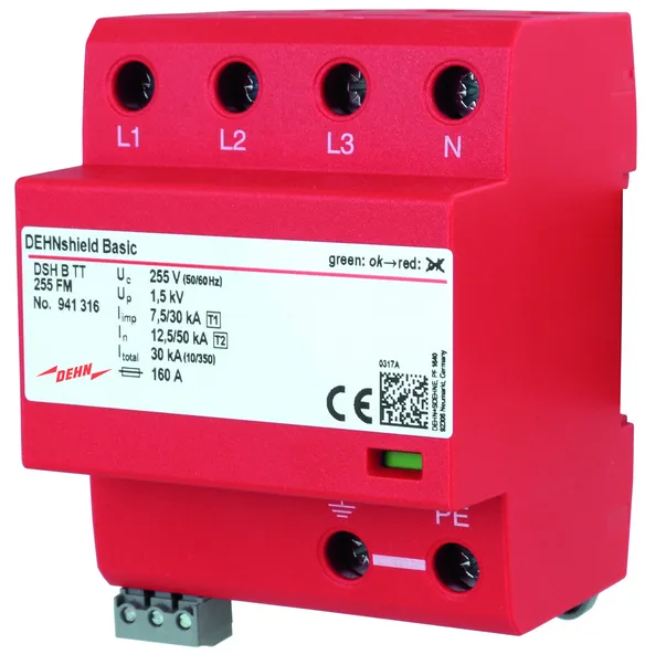 Application-optimised and prewired combined lightning current and surge arrester for TT and TN-S systems for use in the main power supply system (3+1 configuration) for residential buildings without external lightning protection (also for buildings supplied by overhead lines); with floating remote signalling contact.