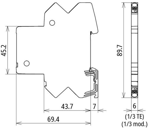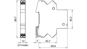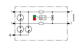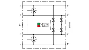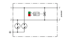 Space-saving, compact surge arrester with a width of 6 mm and push-in connection technology with status indication. Finely limiting, single-stage surge protection with powerful diodes for protecting two single cores sharing a common reference potential as well as unbalanced interfaces.