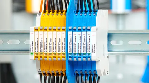 Condition monitoring unit DEHNrecord, set for DIN rail mounted devices with integrated visual transmitter/receiver and visual reverse BLITZDUCTORconnect arresters and DEHNpatch with LifeCheck. Visual arrester status indication via LED group display in combination with remote signalling contact (break contact).