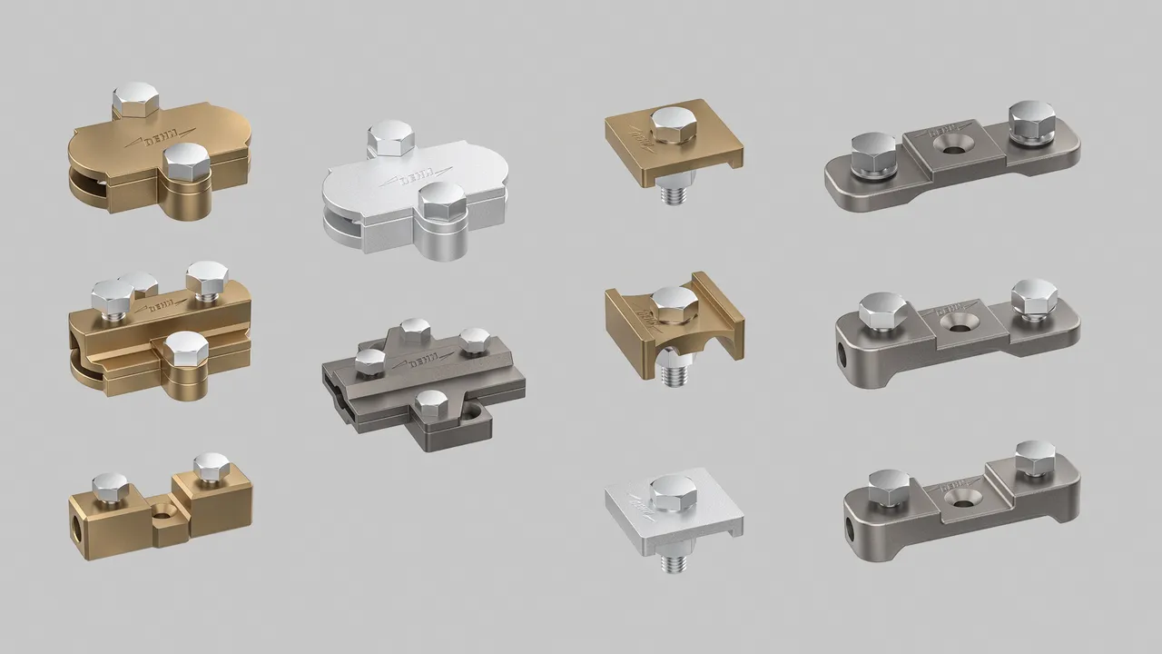 Available in a range of configurations providing interconnection between various conductor types such as flat tape to flat tape, solid conductor to flat tape, stranded conductor to flat tape, solid conductor to solid conductor. These connectors avoid bimetallic corrosion and are mechanically strong to ensure a lasting connection. The Clamps are designed with a central mounting hole for fixing the clamp to the structure.