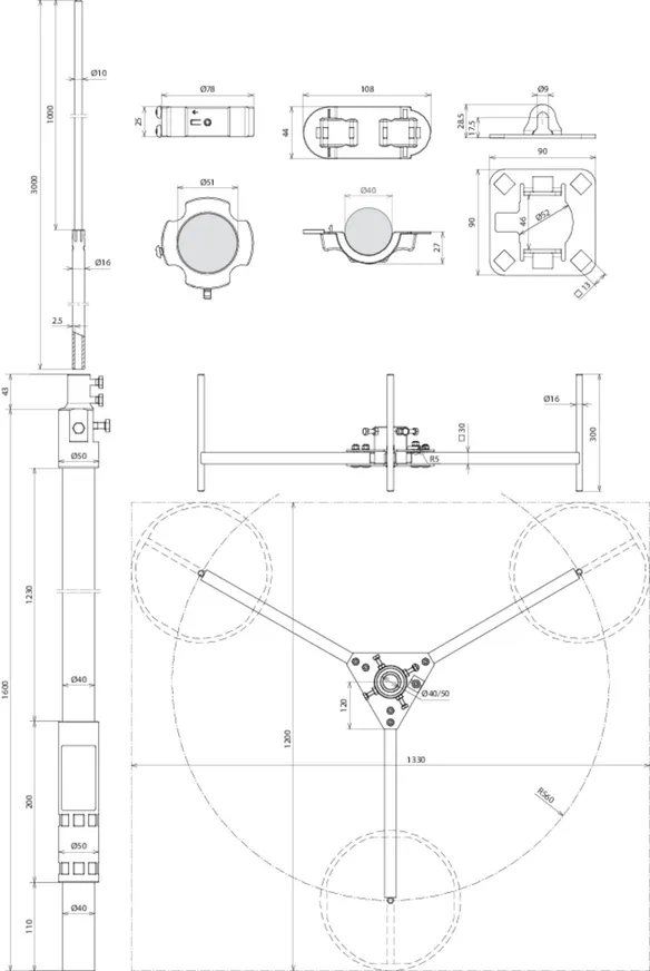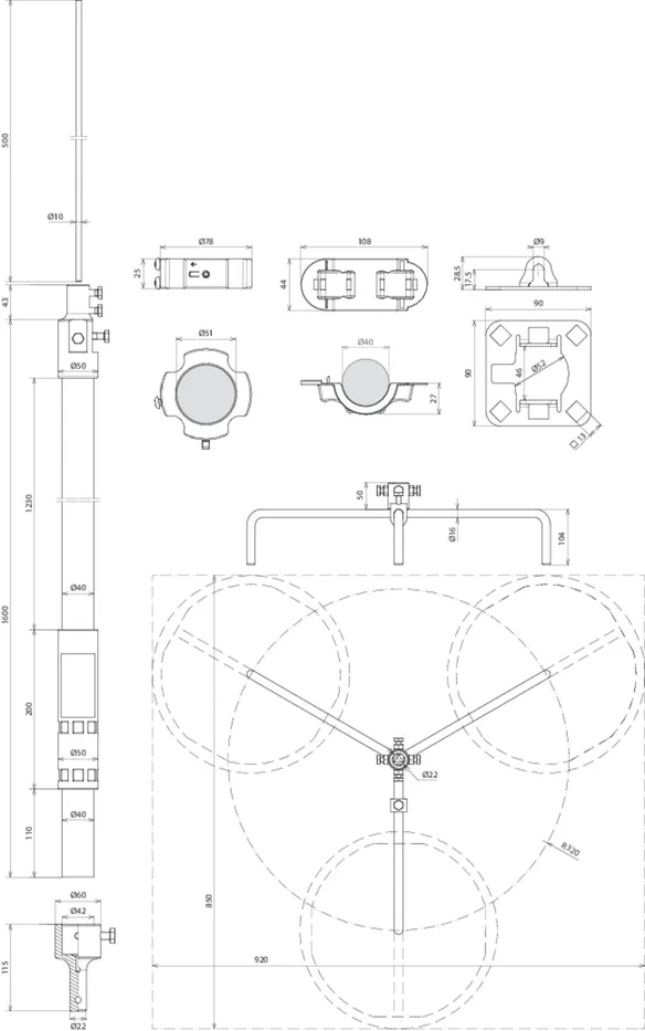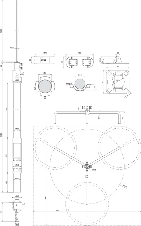 Complete kit, consisting of air-termination tip/rod, supporting tube, fixing kit (including connection plate, plastic holders, cable ties and EB connection element) and stand.