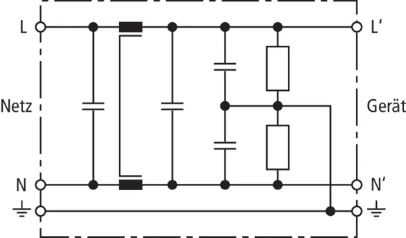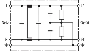 Mains filter for protection against balanced and unbalanced interferences.